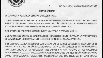 EL ORGANO DE FISCALIZACION DE LA ASOCIACION PROFESIONAL DE MARTILLEROS Y CORREDORES PUBLICOS DE SANTA CRUZ CONVOCA PARA EL DfA 15/12/2025, A ASAMBLEA GENERAL EXTRAORDINARIA CON EL FIN DE ELEGIR NUEVA COMISION DIRECTIVA