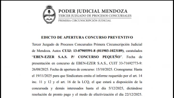 Tercer Juzgado de Procesos Concursales Primera Circunscripción Judicial de Mendoza. Autos CUIJ: 13-07905591-8 (011903-1023189), caratulados "EBEN-EZER S.A.S. P/ CONCURSO PEQUEÑO". Fecha de presentación en concurso de EBEN-EZER S.A.S., CUIT 33-71692773-9: 26/08/2025.