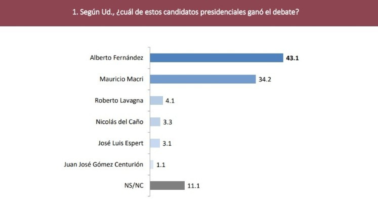 Según el estudio sobre 1.500 casos, el 43,1% de los consultados cree que Fernández ganó el debate, mientras que un 34,2% se inclinó por la exposición del presidente Macri.