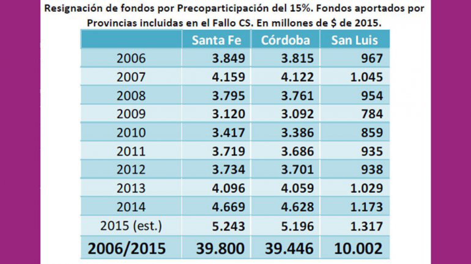 EN UNA PROYECCIÓN NACIONAL, LA DETRACCIÓN INDEBIDA FUE DE $415.000 MILLONESCon esta decisición, la Corte dejó abierta la puerta a que se produzcan nuevos reclamosdesde otros gobiernos provinciales, pues el Tribunal señaló que "han transcurrido casi 20 años desde la fecha fijada por la Constitución Nacional para establecer un nuevo régimen de coparticipación", que en su artículo 75 inciso 2 exige garantizar "la remisión automática de fondos y que contemple criterios objetivos de reparto, que sea equitativa, solidaria y que dé prioridad al logro de un grado equivalente de desarrollo, calidad de vida e igualdad de oportunidades en todo el territorio nacional"