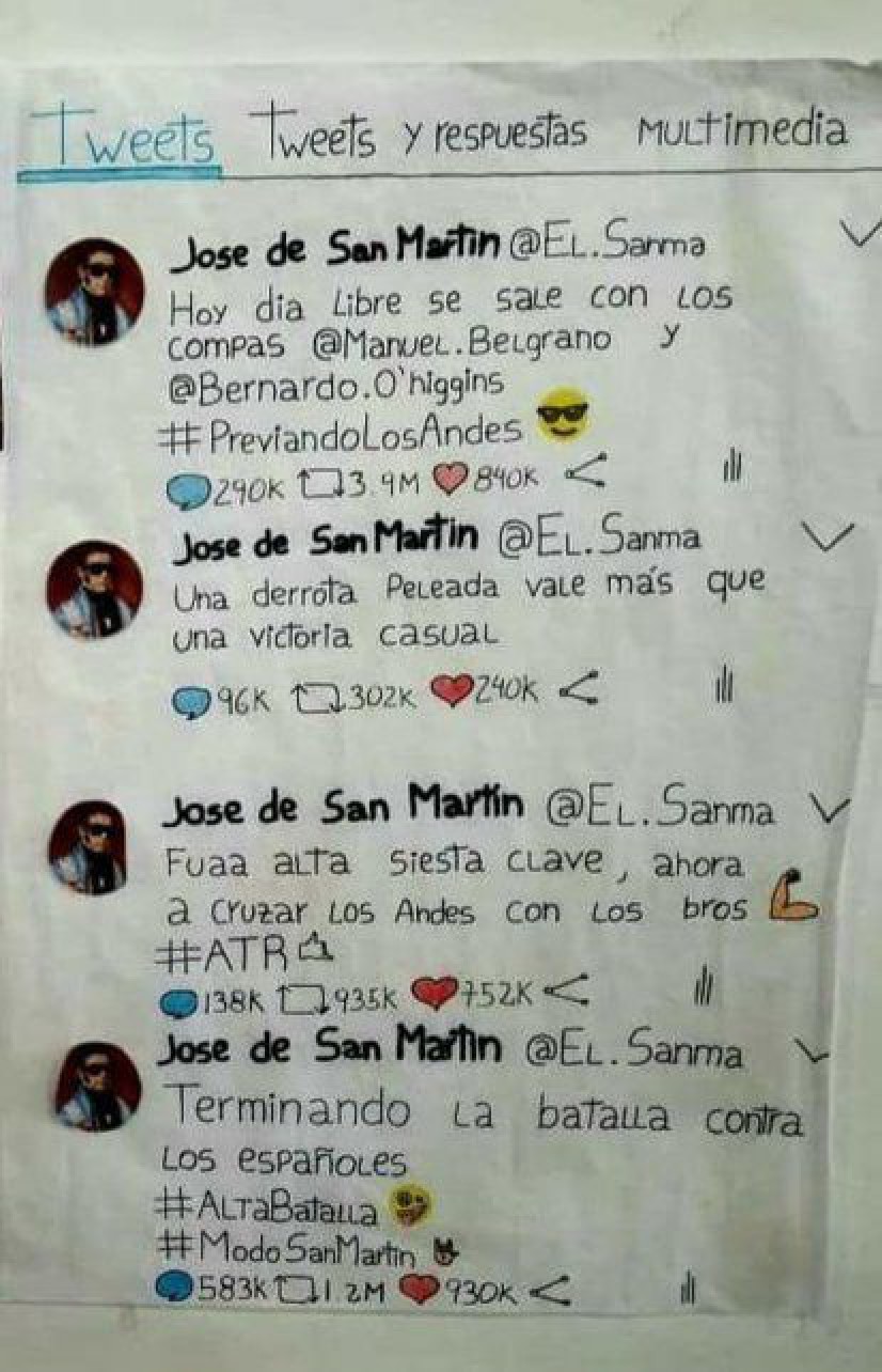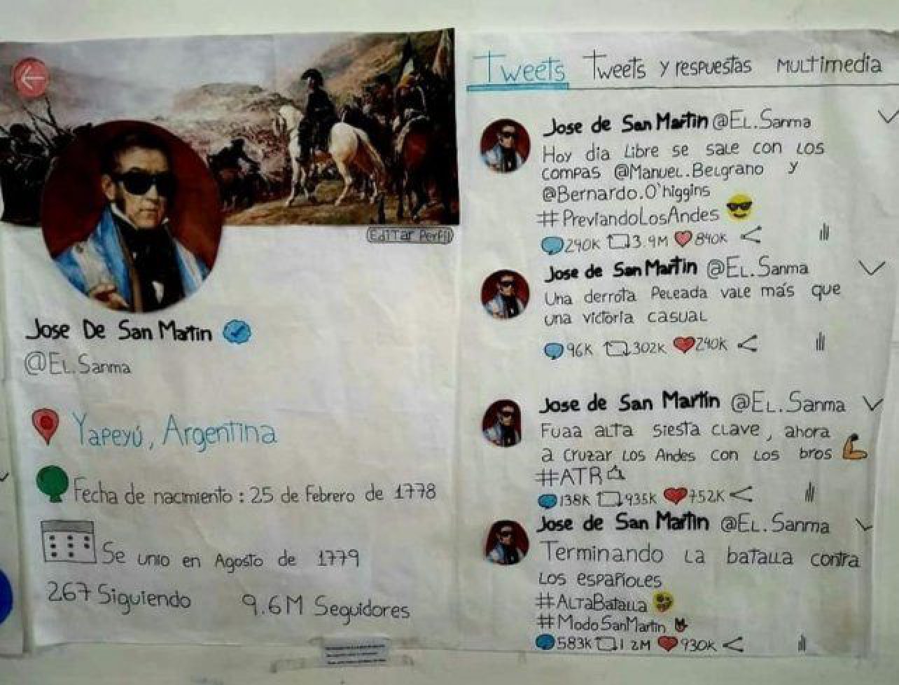 Una tarea realizada por alumnos de un colegio de 5º año de Neuquén se convirtió en tendencia en las redes sociales. A los chicos, que tuvieron que idear una situación por un nuevo aniversario del fallecimiento del General José de San martín, decidieron crearle un perfil en Twitter, con sus seguidores y sus publicaciones. Para eso combinaron contenido, con creatividad y algo de humor con el estilo que caracteriza a los millennials y, propio del espíritu sanmartiniano, y terminaron revolucionando las redes.