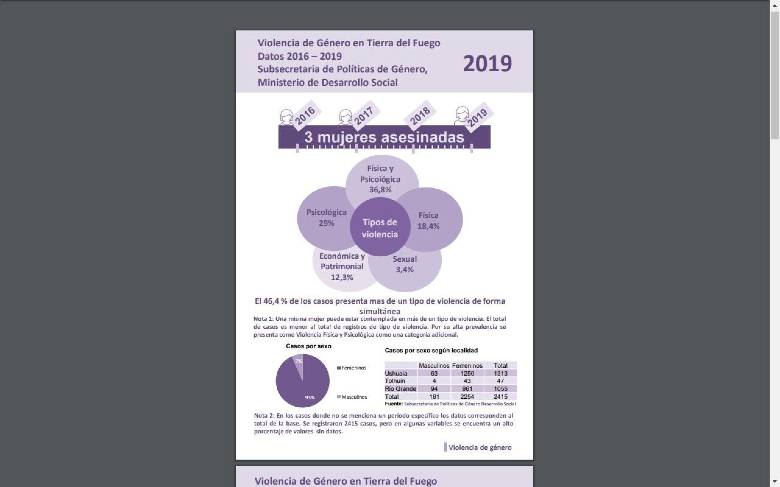 Con el objetivo de concientizar a la sociedad el Ministerio de Desarrollo Social de la provincia hace llegar a la comunidad los datos estadísticos relevados en los últimos años sobre violencia contra la mujer. Es la primera vez que el ejecutivo provincial releva los casos de violencia contra la mujer a fin de generar una base de datos que permita tomar decisiones basados en estadísticas reales.