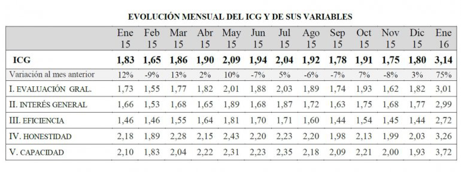 El Índice de Confianza en el Gobierno (ICG) que realiza la Universidad Di Tella junto a la consultora Poliarquía reveló hoy un aumento notable, que atribuyó a las expectativas que genera un cambio de de Gobierno. El indicador se ubicó en 62,8%, lo que representa un crecimiento del 75% en comparación con diciembre y de 71% con enero de 2015.